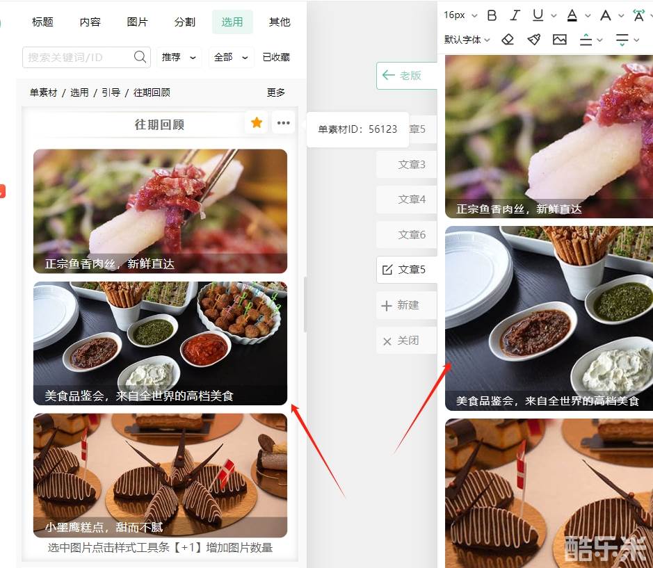 我们来新建一个文章演示一下,首先要选择一个素材哦。继续往下翻,还有带图片的往期回顾样式呢,我们就以图片样式为例吧。
