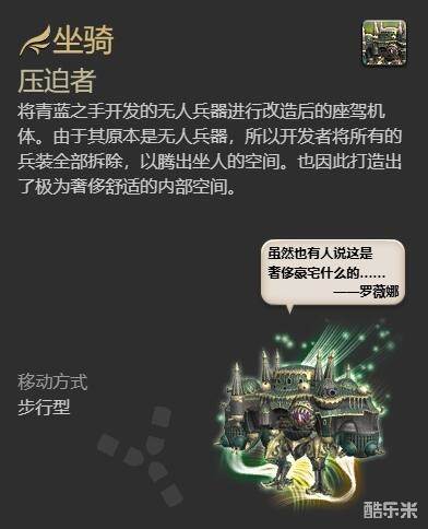 压迫者是将青蓝之手开发的无人兵器进行改造后的座驾机体,很多玩家都想知道ff14压迫者坐骑怎么获得,玩家参与星里路标第6轮系列赛,且在7.1版本更新前系列赛的等级达到25级即可获得,下面和酷乐米小编一起来看看吧