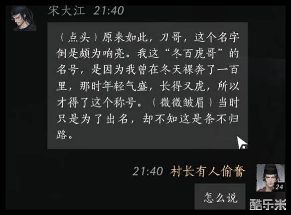 宋大江:(微笑,接过酒)游侠真是豪爽之人!不过我这人有个毛病,喜欢边喝边讲故事。你可曾听过“冬百虎哥”这个名号?这就是我的故事的开头。(端起酒杯轻抿一口)
