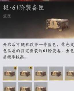 开启后可随机获得一件蓝色,紫色或金色品质的指定套装的61阶装备,金色品质概率较高。