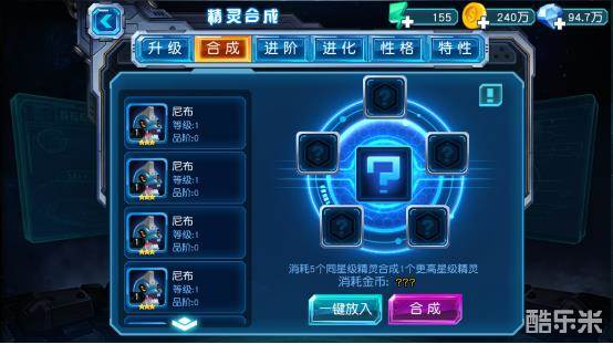 五个同星级的精灵随机合成一个更高星级的精灵,同时并带有暴击效果,有几率合成多个高等级的精灵,
