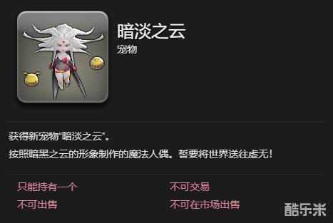 最终幻想14之中暗淡之云是游戏的一只宠物,有很多的玩家都非常的好奇这个宠物要怎么获得,玩家击败50级的副本【水晶塔 暗之世界】的boss暗黑之云,就有概率获得获得这个宠物,下面和酷乐米小编一起来看看吧