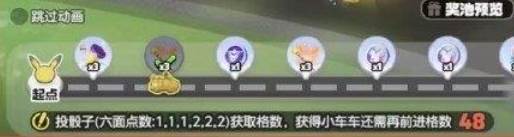 使用骰子后,可使得界面下方小车车获得指定前进格子数,训练家们可获得踩到格子的对应奖励,但无法获得经过的格子奖励。
