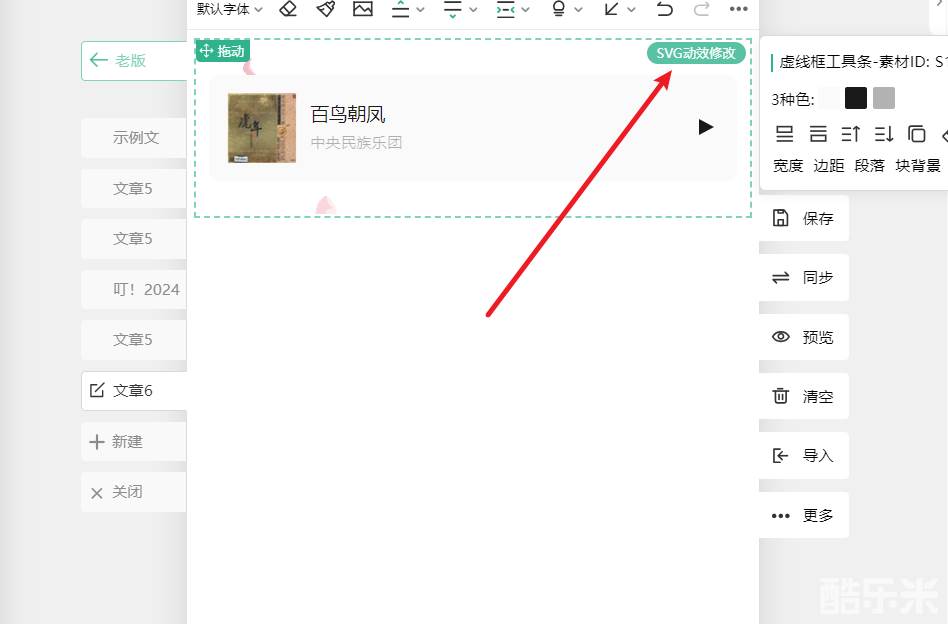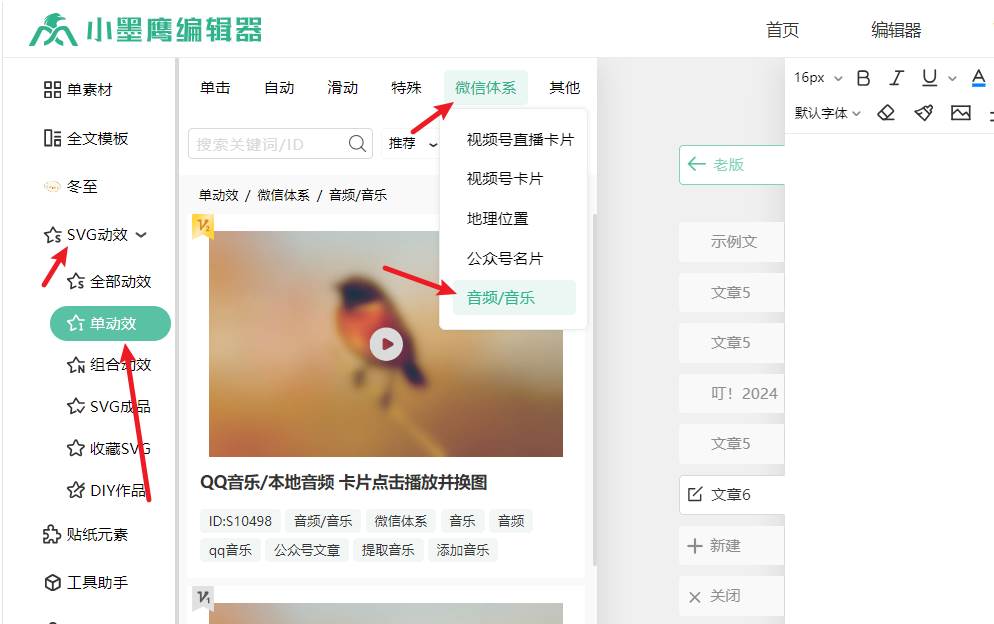 我们这里用到的工具是小墨鹰编辑器,先点击小墨鹰编辑区左侧的“SVG 动效 - 单动效 - 微信体系 - 音频\音乐”,挑选一款心仪的音频样式写入编辑区。