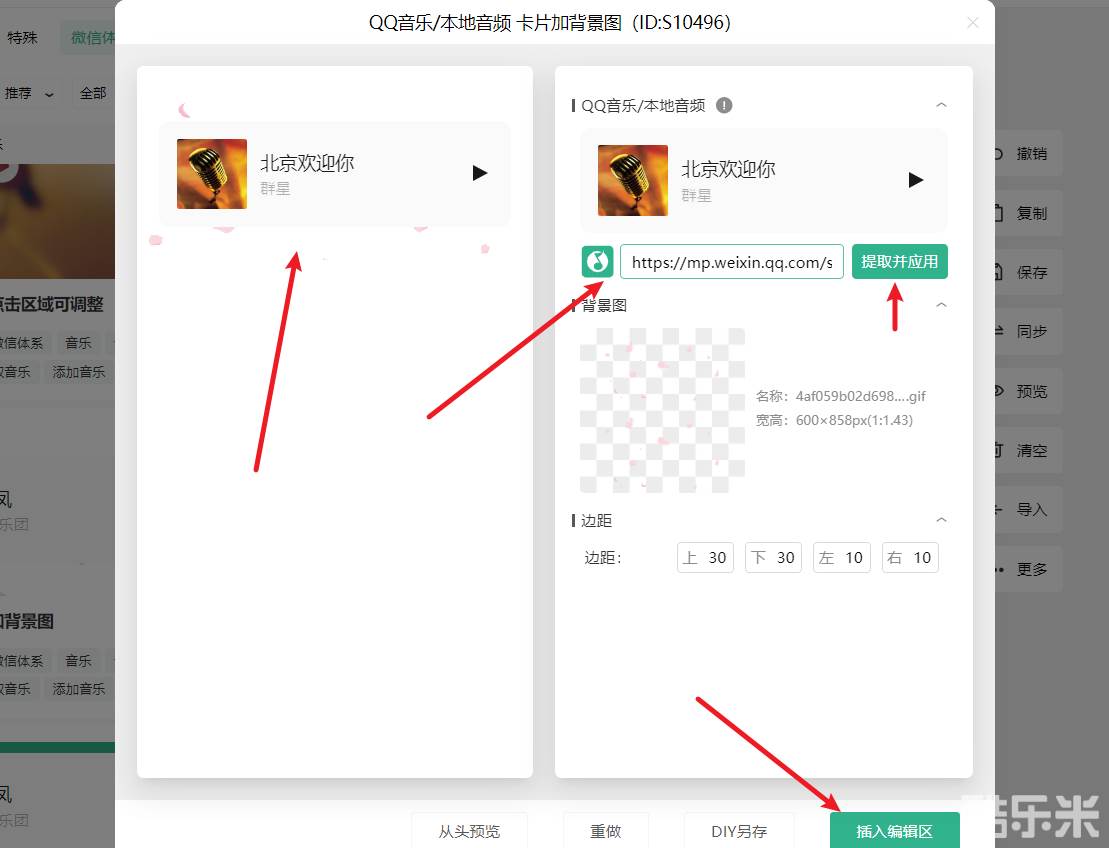 接着输入含视频号的微信文章链接,完成提取与应用后,将其插入编辑区。