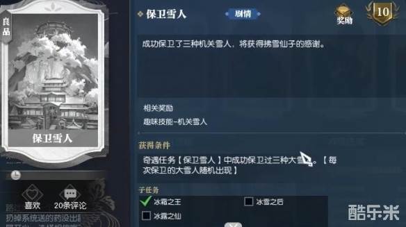 完成奇遇保卫雪人可获得趣味技能,很多玩家想知道保卫雪人怎么完成,前往瑶光城(180.384)点击小雪堆,滚雪球触发对话【顾拂雪】开始保卫雪人小游戏,完成游戏即可完成奇遇,下面和酷乐米小编一起来看看吧