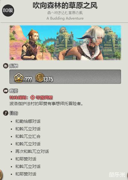 在最终幻想14之中悌阳象族是游戏中的蛮族之一,那么这个蛮族的任务要怎么开启呢?玩家首先需要将自己提升至80级,并且完成主线任务【晓月的终途】,随后完成前置任务后就可以在萨维奈岛开启这个蛮族的任务,下面和酷乐米小编一起来看看吧