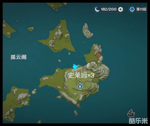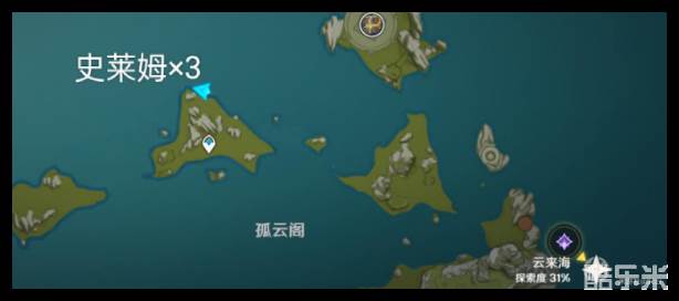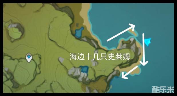 图解:这个是水史莱姆的聚集地,是我找到的攻略中最靠谱的,很易找,先去到云来海这个锚点,走到崖边飞下去可以看到沙滩边有史莱姆。