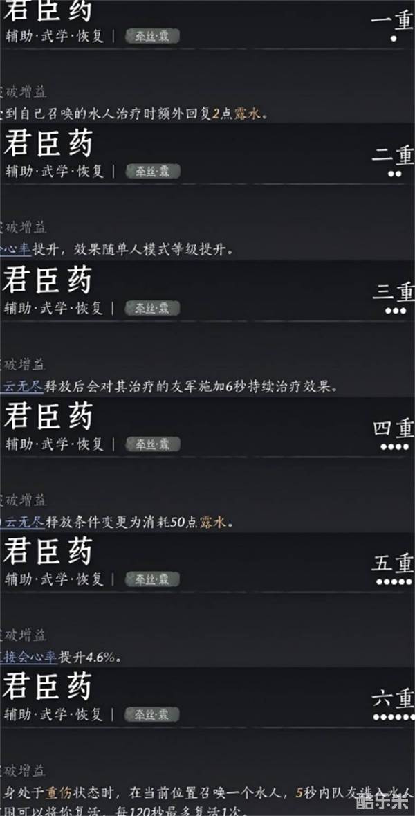 君成药:这是奶妈心法中的基础心法,能大幅提高治疗效果,重数越高,治疗效果越好。建议尽量堆到3层。