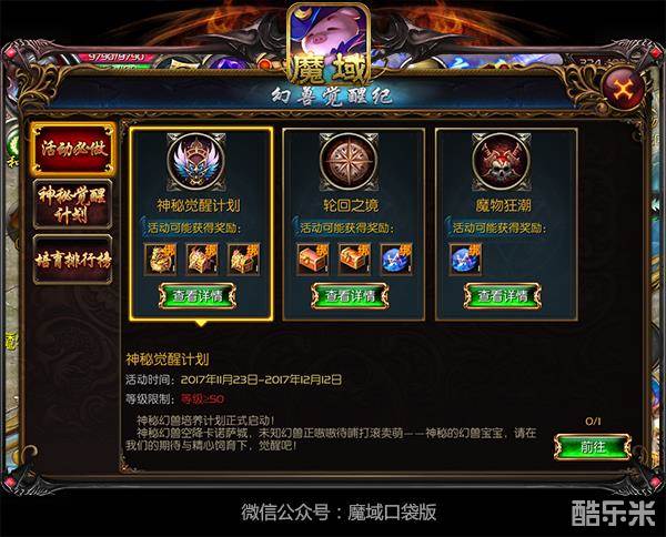 即日起,玩家们就可通过神秘觉醒计划活动抢先体验到幻兽觉醒的热血与刺激,每完成一阶觉醒便可获得回馈宝箱,而荣登培育排行榜的玩家还可获得额外奖励,而只要探秘魔族幻境“轮回之境”及参与“魔物狂潮”的魔族攻城活动便可获得“神秘觉醒计划”活动中所需的觉醒核晶,还不快快动起来!