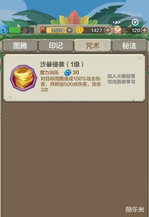 沙暴侵袭(1级)魔力消耗30对目标周围造成100%攻击伤害,并附加500点伤害,攻击3次。