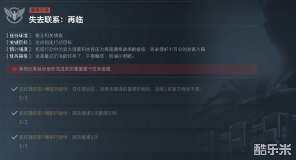三角洲行动s3赛季中,失去联系是获得3x3保险箱的倒数第三个任务,那么这个任务要怎么完成呢?我们需要在同一局游戏内带着曼德尔砖杀一个玩家,随后完成破译并且撤离才可以完成这个任务,下面和酷乐米小编一起来看看吧