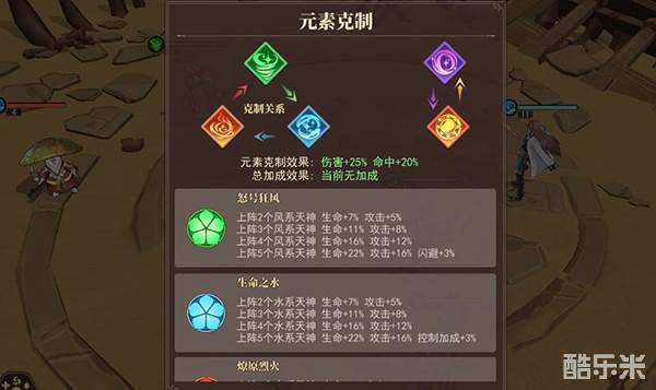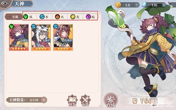1、游戏包含了水、火、风、光和暗五种属性类型的天神。