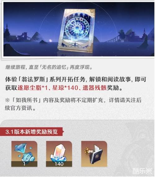 体验3.1版本开拓任务后阅读全新故事即可获取遂愿尘脂星琼等奖励!