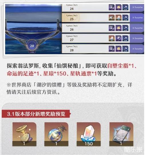 《崩坏:星穹铁道》3.1更新奖励内容是什么呢,很多玩家都想知道新版本地图奖励更新有哪些,那么接下来了酷乐米小编给大家详细介绍一下更新的地图奖励,有兴趣的玩家可以参考一下。