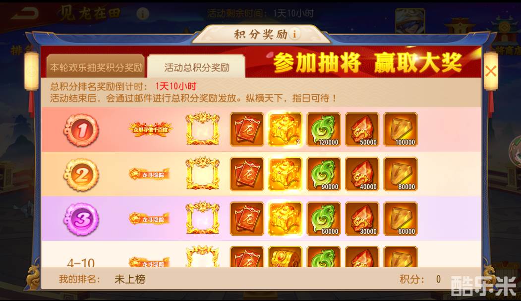 4、每轮欢乐抽奖持续1个小时,其中前50分钟为抽奖时间,最后10分钟为开奖和公示时间(小乔温馨提示:在开奖和公示时间内进行招募,所获得积分不会计入欢乐抽奖积分排行榜中,会计入活动总积分排行榜)。