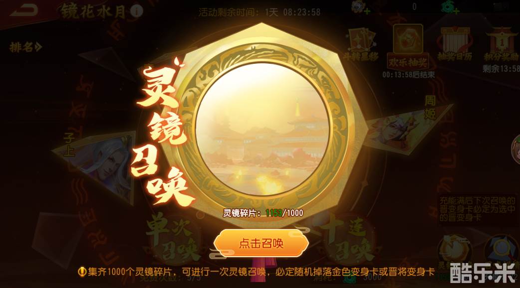 三国杀名将传镜花水月活动开服时间≥40天才能参与,在镜花水月活动中,主公每天有5次免费的召唤机会,每次召唤有1小时的冷却时间,主公可以进行单次召唤和十连召唤。下面和酷乐米小编一起来看看吧