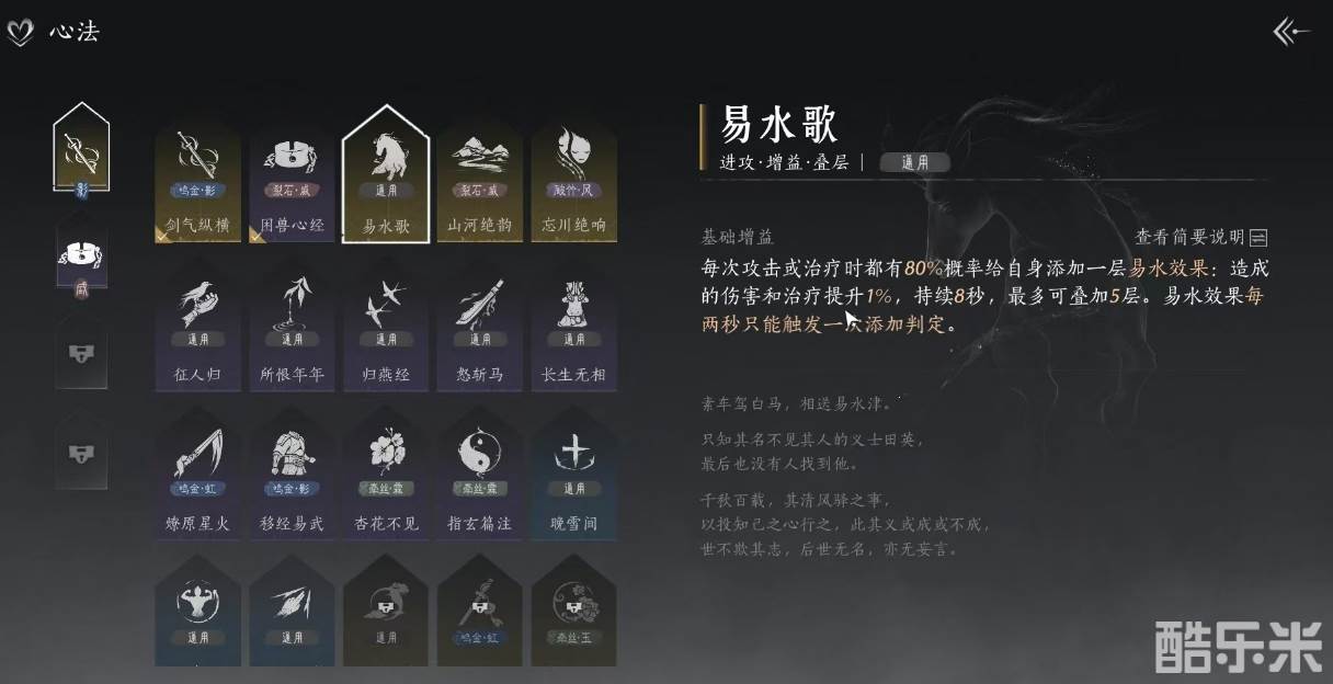 首先推荐无名心法,这是无名剑的基础和核心心法,可以大幅度提升剑的技能效果。其次是威猛歌,可以增加剑客的攻击力,在战斗中提升输出能力,是重要的心法之一。然后是易水歌,适配性较好,可以提升全局输出效果。最后是千山法,这个心法推荐给武器搭配为剑➕枪的玩家,这个技能可以回耐力。