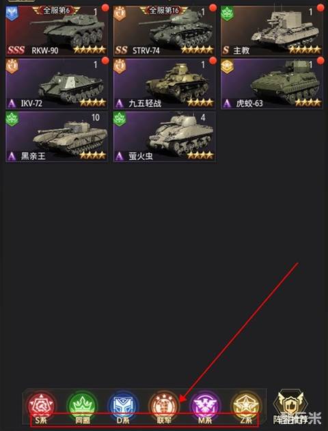 3、坦克阵营之间还存在克制关系,s系、联军、D系、同盟四种阵营相互克制,Z系和M系两种阵营互相克制。