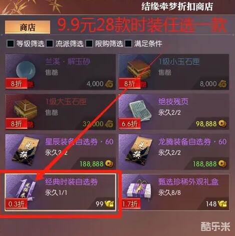 结缘牵梦活动中玩家可用9.9元买时装,很多玩家想知道结缘牵梦折扣时装怎么买,先在结缘牵梦折扣商店购买经典时装自选券(售价9.9元),然后打开经典时装自选券兑换商店,选择想要购买的时装即可,下面和酷乐米小编一起来看看吧