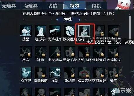 4、解锁后领取动作【拈花一笑】,在【动作-特殊】可使用。