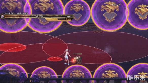 6、随后场地中会出现很多的红圈和紫圈,我们首先躲避紫圈的攻击,接着躲避红圈的攻击。