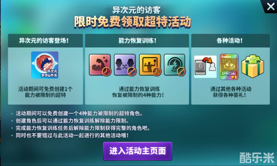 异次元世界角色再度来袭,活动期间可以免费创建一个4种能力被限制的超特角色。