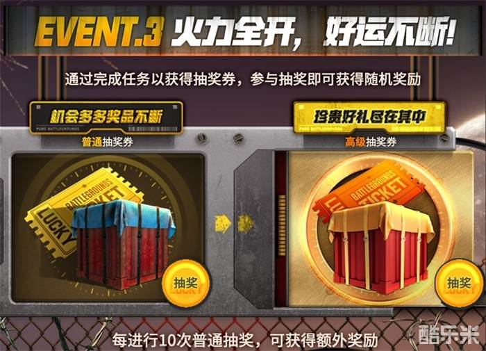 活动3:火力全开,好运不断!使用普通抽奖券和高级抽奖券参与抽奖,不仅有机会获得稀有道具,累计抽奖次数还可获得黑货票券,最新的限时皮肤火力全开衬衫及G-COIN等奖励哟!火力全开,好运连连!
