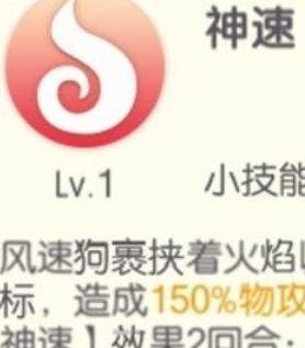 风速狗裹挟着火焰以神速来回冲撞敌方单体目标,造成150%物攻+30的物理伤害,并发动【神速】效果2回合:提升自身40%的速度。