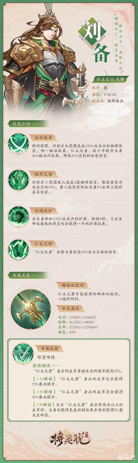 刘备定位【先锋】,是一个每次冲在队伍最前方,守卫主公的将领。