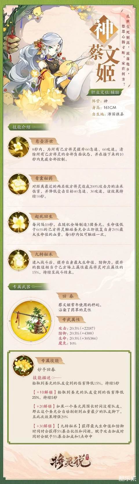蔡文姬是神族医师,擅用回天治疗之术,喜爱捣鼓奇怪的技法。