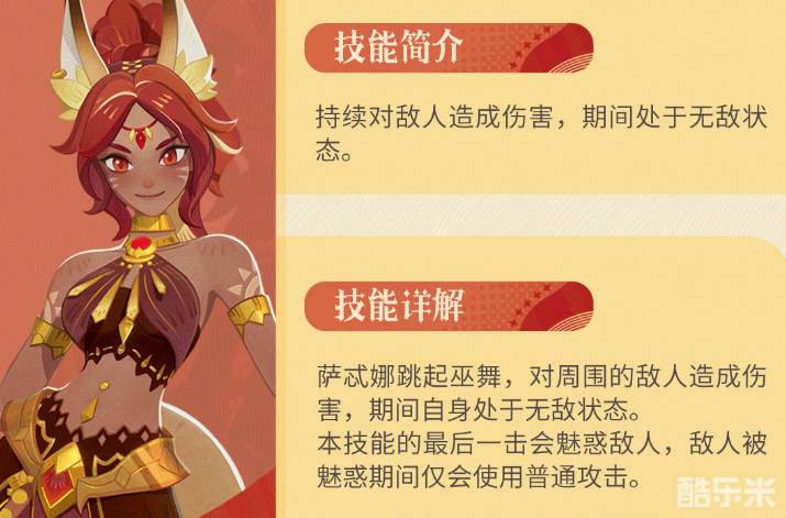 技能效果:萨忒娜跳起巫舞,对周围2格的敌人造成共240%伤害,期间自身处于无敌状态。该技能的最后一击会魅惑敌人2秒,敌人被魅惑期间仅会使用普通攻击。随着技能等级的提升,伤害会逐渐增加,最高可提升至300%,且在二级时最后一击会魅惑敌人,三级、四级、五级的伤害依次递增。