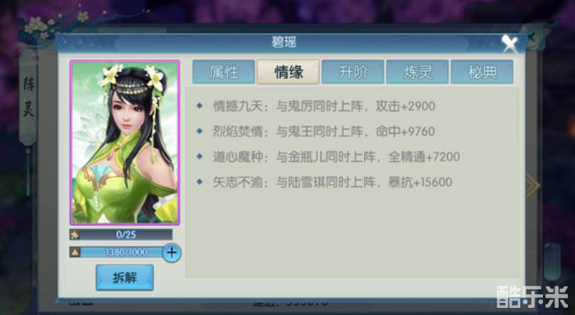 在体验游戏的时候,玩家如果组队,碧瑶其实能够跟其他的角色搭配,这样能够发挥较大的威力,如果玩家将碧瑶跟鬼厉同时上阵,这时候他的攻击性就会增强。其实碧瑶这个角色在情缘属性当中属于一大特色,简单来说就是玩家可以利用碧瑶这个角色,跟其他的角色建立情缘,能够获得额外的属性加成。
