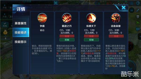 三技能:曹操开启三技能时对周围造成物理伤害,并能大幅度提升自身攻击力和韧性,普攻和技能命中敌人时都可以回复生命,持续一段时间。三技能是曹操的核心技能,大招的吸血能力不仅可以为曹操提供赖线能力同时还能增加输出伤害。当自己残血时开启大招,然后利用一技能和普攻配合使用对敌人打出一套连招,不仅造成高额伤害并且能回复生命,在关键时刻将敌人反杀。