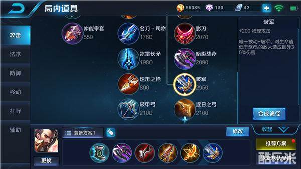 这套有非常高的爆发伤害,破甲弓提升破甲伤害,中期面对敌方半肉战士也不错的输出伤害。破军则是提升对半血英雄的伤害,一套连招下来直接将脆皮打成残血,配合破军的被动完美收割。
