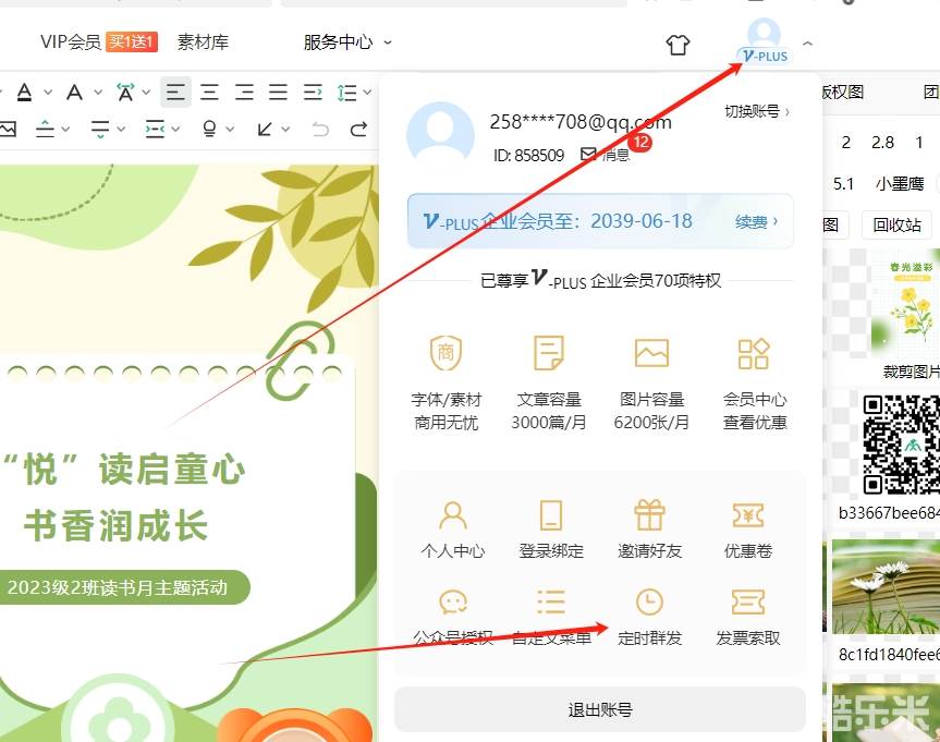 首先,进入小墨鹰编辑页面,接着点击右上角头像,选择“定时群发”。