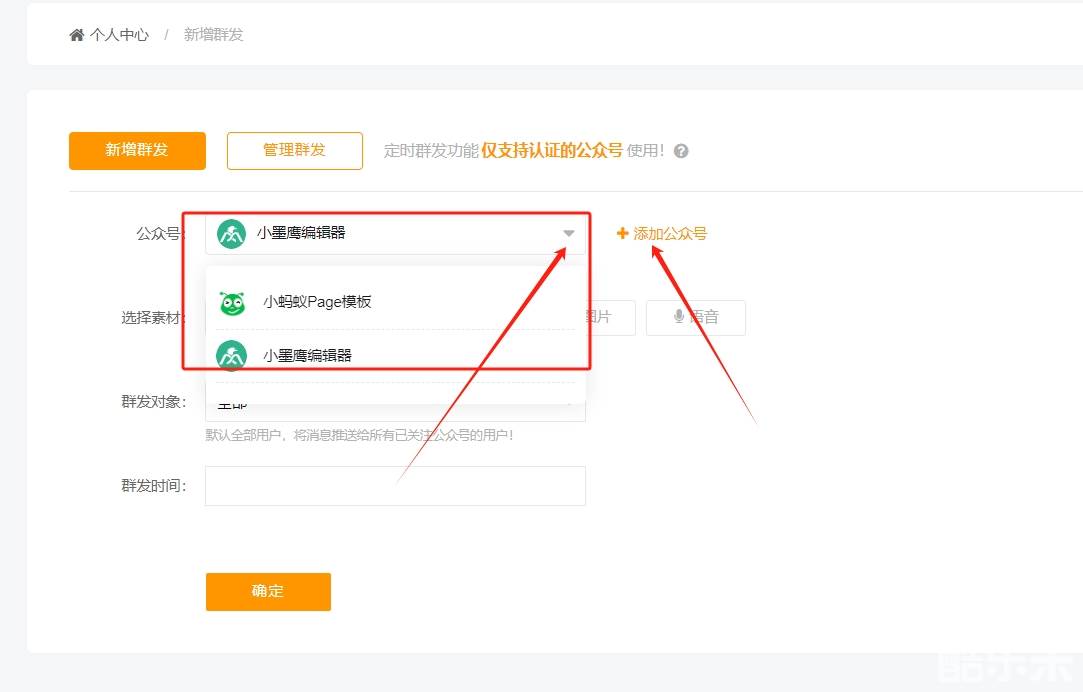接着,挑选需要群发的微信公众号,这里需要注意先授权微信公众号哦。如果还没绑定公众号,点击“添加公众号”进行授权即可。