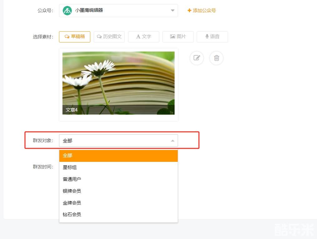 在“选择素材”环节,你可以从草稿箱中挑选已编辑好的文章,或者选择历史图文、文字、图片、语音等其他形式的素材。