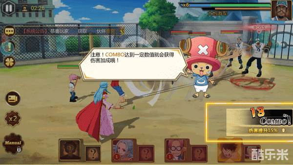 战斗开始后点击高亮的角色头像可以释放技能,当攻击达到一定的数值之后可以获得伤害加成!
