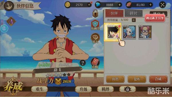 3、点击伙伴之后再进行养成的界面,使用战斗后获得的手册可以用来激活,激活之后可以将角色进阶为实习海盗,提升角色的等级!
