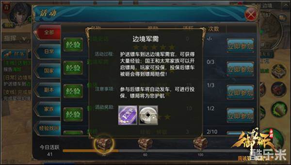 《御龙在天手游》中,边境军需活动凭借丰厚的经验奖励深受玩家追捧,是每天必做的经验日常任务。在镖车行进的过程中,我们也可感受护镖与砸镖时战斗的激情,砸毁敌人的镖车还可以获得银子和绑银奖励。