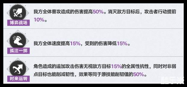 第三个buff是直伤的buff,适配非追击,非普攻的角色。如大黑塔,黄泉。