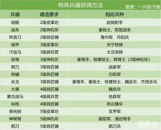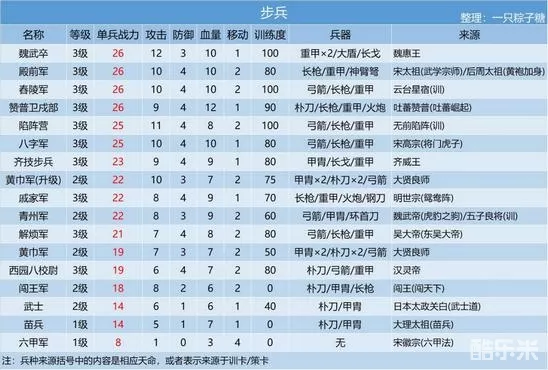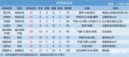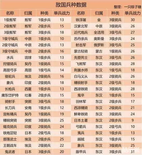 在这里,你将会看到所有可组建兵种的详细数据,兵种克制问题,特殊武器的建造要求,敌国兵种等各种汇总图!