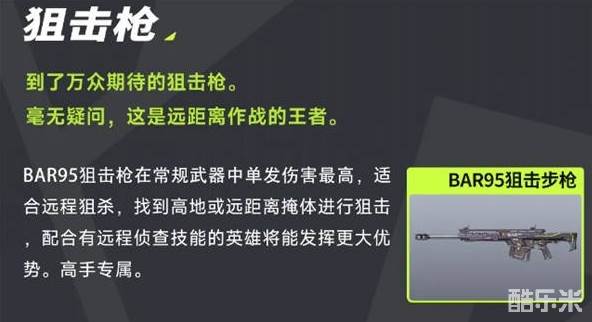 BAR95狙击步枪是远光84中单发伤害最高的狙击枪,高精度和强大的杀伤力使其成为远程狙杀的首选。玩家可以在找到高地或远距离掩体的情况下使用BAR95狙击步枪,配合远程侦查技能的英雄,可以更有效地发现和消灭敌人。