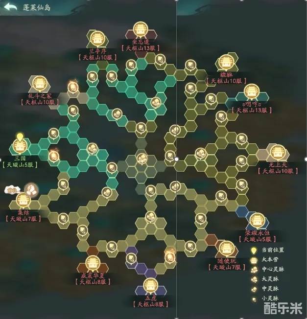 蓬莱地图总共三层,其实三层的地图是一摸一样的,不一样的只有层数越高排名积分获取的越多,地图中总计1个四级灵脉(活动期间每晚8点开放争夺),4个三级灵脉,4个二级灵脉,28个一级灵脉以及12个大本营(大本营积分等同于一级灵脉),灵脉等级越高产生的灵晶越多,所以占领更多的灵脉不仅积分会更高,灵晶也会更多,灵晶可以在商店兑换资源~~