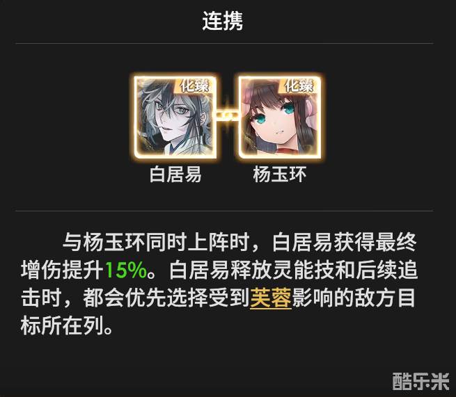 与杨玉环同时上阵时,白居易获得最终增伤提升15%。白居易释放灵能技和后续追击时,都会优先选择受到芙蓉影响的敌方目标所在列。