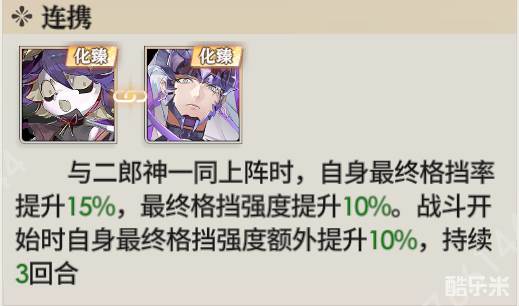 与二郎神一同上阵时,自身最终格挡率提升15%,最终格挡强度提升10%。战斗开始时自身最终格挡强度额外提升10%,持续3回合