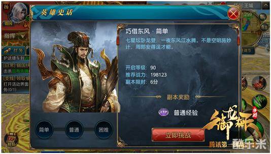 巧借东风副本是以历史上著名的“赤壁之战”为背景,周瑜巧施苦肉计,让黄盖假意投奔曹操,并向曹操献上了“连环计”。把大船小船全用铁链连接起来,可又因为担心深冬季节没有东南风而苦无良策,诸葛亮借来东风,并且提前安排好后路,顺利躲过周瑜的追杀,从江东脱险。在《御龙在天手游》中,巧借东风是90级开启的英雄史话副本,在玩家达到90级后,并且全部通关80级副本的英雄史话“单骑救主”之后才可以进入巧借东风。巧借东风英雄史话副本有着简单、普通和困难三个难度,只有通关当前难度之后才可以挑战下一难度,每个难度的副本只能通关一次,通关副本之后奖励丰厚的经验以及通元丹奖励。