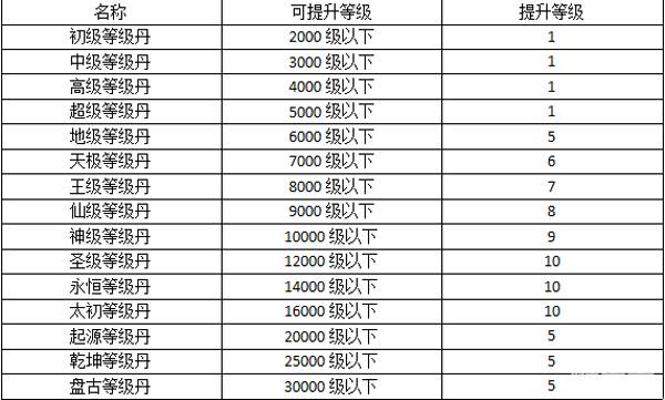 等级丹分为15个等级,不同等级丹对应提升如下: