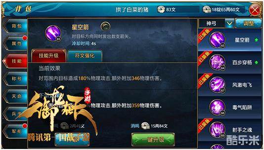 乱星坠可带来高输出群攻、百步穿杨可以在我方与敌方战力相差悬殊时刻,作为逃跑备用;风激电飞可保证攻击多人持续伤害;再配上高伤害输出的星空箭,实力杠杠滴!